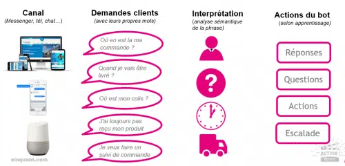 - Ceux qui permettent des interactions plus riches , grâce à un meilleur moteur d’analyse sémantique (compréhension des demandes des clients à travers le contexte et les synonymes, pas l’analyse des mots clés) et la possibilité de lancer des actions (par exemple, passer une commande, gérer la preuve de retour, etc.).