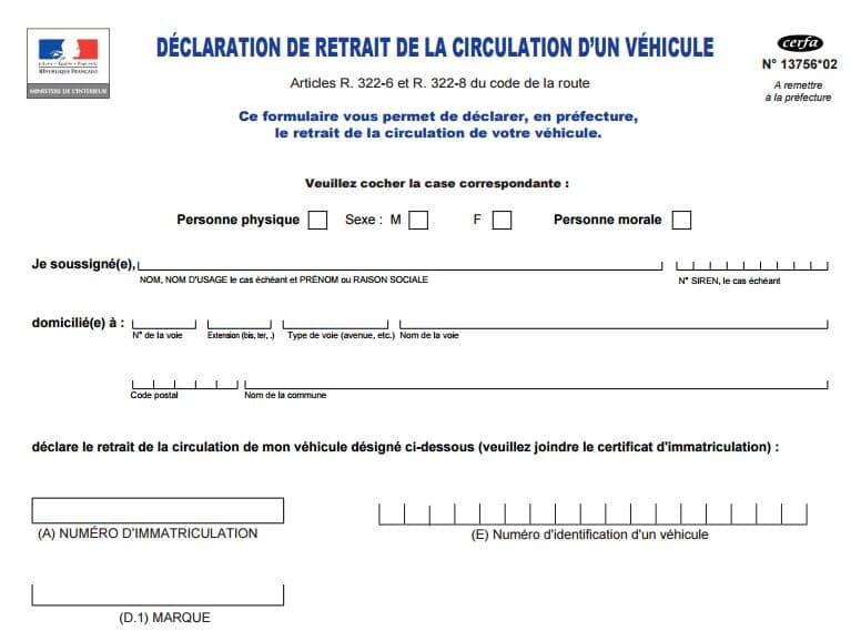 — demande de remplir le formulaire CERFA n°13756*02 pour la déclaration de retrait de mouvement du véhicule.
