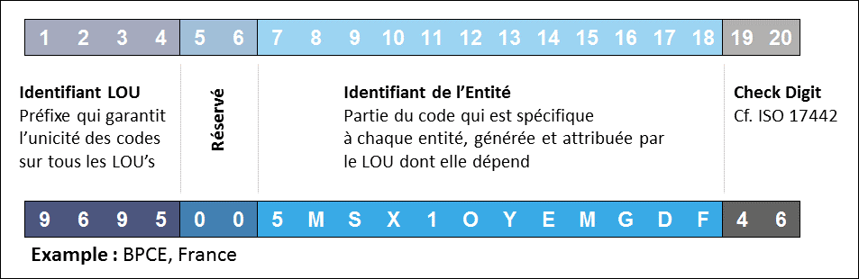 Les quatre premiers caractères identifient le LOU qui a délivré le code ; 9695 est réservé, par exemple, à l’INSEE. Chaque LOU a son propre code LEI. Cet identifiant joue ainsi à la fois le rôle de signature et de traçabilité pour les données dans les fichiers XML publiés.