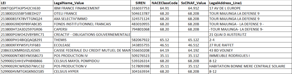Le champ LEI ouvre le fichier, puis suivent l’adresse, la forme juridique, le statut de l’entité. L’élément Extension inclut des informations propres à la France, comme le code Sirene (316 037 753) ou la classification NAF/NACE. S’y ajoutent la date d’attribution du LEI (ici, le 27/9/2012) et le statut d’activité, qu’il est possible de vérifier avec le code Sirene dans des registres tels que InfoGreffe. Le croisement de ces renseignements avec les bases nationales fait partie des obligations assignées à chaque LOU par la GLEIF, qui officialise la liste des autorités nationales de référence (comme Sirene, Info Registry, AMF pour la France).